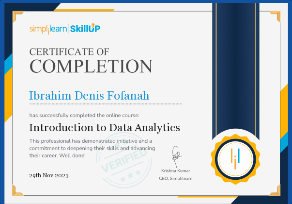 Ibrahim Denis Fofanah has successfully completed the online course Introduction to Data Analytics. Upgrade your skills with 100+ free courses