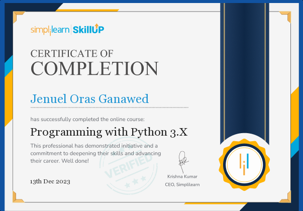 Jenuel Oras Ganawed has successfully completed the online course Programming with Python 3.X. Upgrade your skills with 100+ free courses